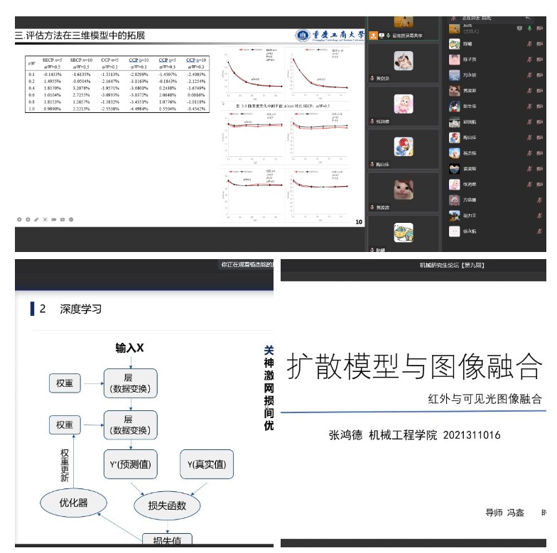 会上,6位2021级研究生就各自的研究内容进行了汇报。屈亮同学介绍了弹塑性断裂约束参数评估方法从二维到三维试件推广的应用,介绍了推广过程中的流程方法,给出了评估数据评估的误差对比;杨杰铭同学对图像处理中关于图像融合和深度学习方法进行了介绍,介绍了在军事、航空等场景图像处理的应用特点;重点介绍了融合方法中的深度学习方法,以及图像识别评估指标;张鸿德同学介绍了扩散模型在图像融合中的应用,主要介绍了图像研究背景,研究现状,扩散模型的原理;给出了扩散模型的训练与采样过程;冯永祯同学以微射流理论作为理论支撑介绍了激光冲击靶材时微喷射形成机理,重点介绍了利用Abaqus进行激光冲击靶材的仿真步骤以及仿真过程中涉及到的参数;陈曦同学首先介绍了蛋白质-液滴盐的咖啡环效应,咖啡环效应的应用,接着介绍了当前研究内容的实验主要实验流程,以及蛋白质液滴的沉积现象观察结果;陶山佳同学分享了磁泳技术的背景及优势,介绍了微流控的基本原理。